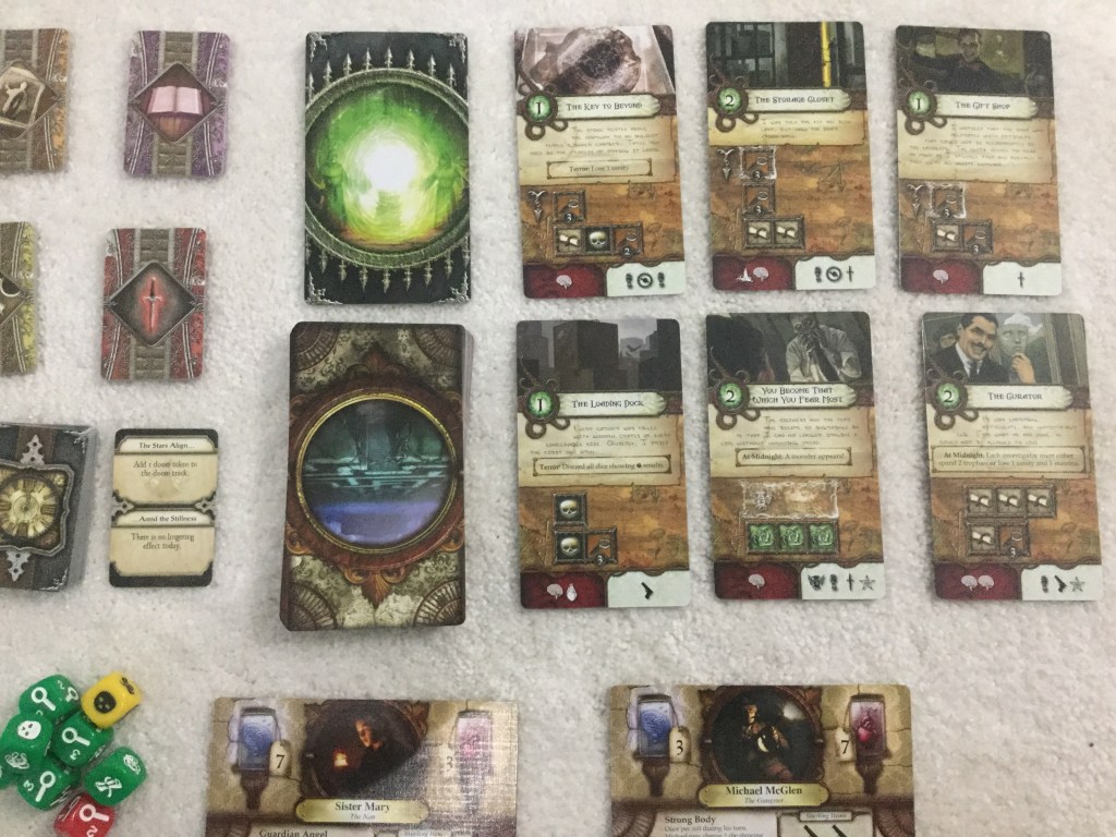 See what I mean about the randomness in the setup? It’s rare that you will have two games where you play the same characters, going through the same rooms, up against the same Ancient One, and if you DO play the game so much that it that you feel you’ve seen it all before, there are five expansions that each add new investigators, rooms, monsters, Ancient Ones and even change the setting or some of the rules.